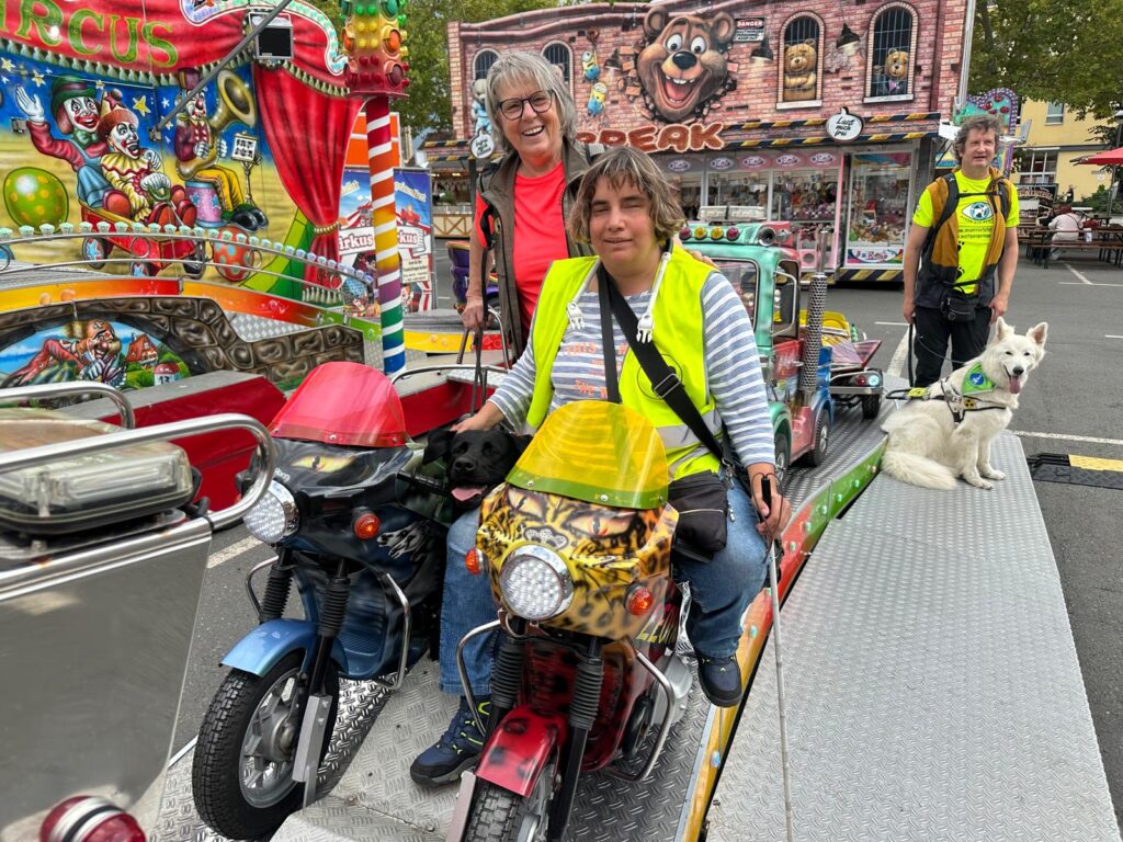 Six guide dogs and their handlers explored Leipzig, Jena and Naumburg. They travelled by public transport, on foot and once by car. During these days together, guide dog mobility specialists Maria Gerstmann and Ingrid Sweeney had time to support the individual teams. The important skill of walking in a group was practised automatically. We spent a morning at a school, where we split up and were able to give almost a hundred children an insight into life with a guide dog. We explored an amusement park and a physics park in Jena, took a guided tour of Leipzig from the perspective of a blind person, went swimming with the dogs, visited Leipzig Zoo and enjoyed the music of one of the participants in the crypt of Naumburg Cathedral.